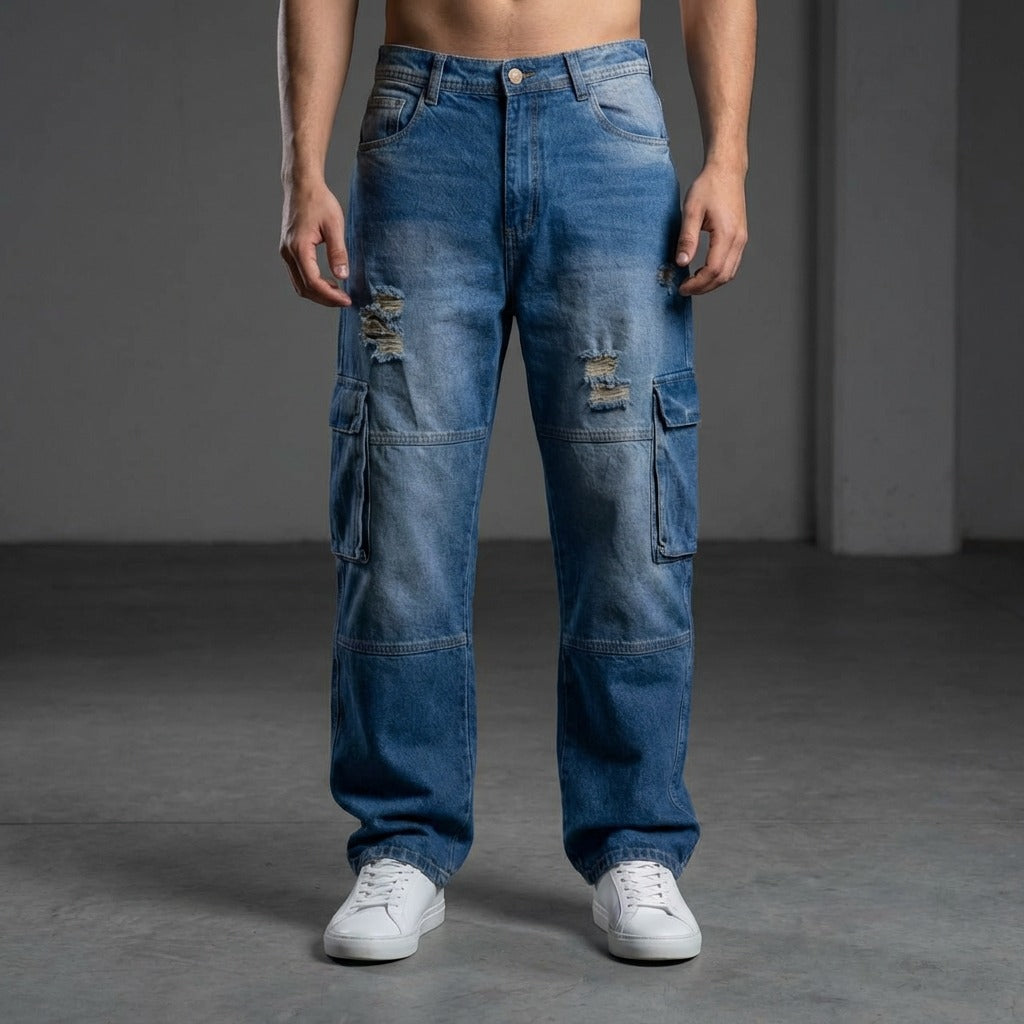 ADN Denim: Jean B42 Baggy Cargo 100% AlgodónLleva el estilo cargo al siguiente nivel con el modelo B42. Inspirado en la cultura urbana más pura, este jean combina la amplitud del corte baggy con la resistencia del algodón 100%.Su lavado en azul índigo con acabados distressed (destroy) aporta una estética cruda y audaz, ideal para quienes buscan un look con mucha textura y carácter. Sin elastano, sin mezclas: solo la frescura y la durabilidad del denim tradicional en una silueta que grita vanguardia.Características clave: